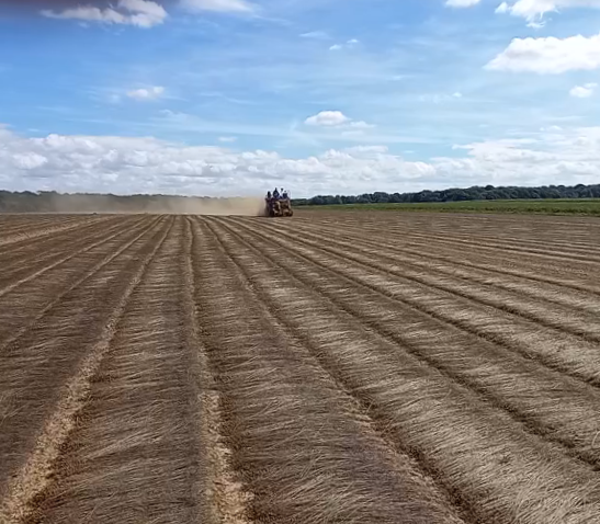 Entre fin juillet et début août, les plants sont arrachés pour préserver la longueur des fibres, puis déposés en andains parallèles.
