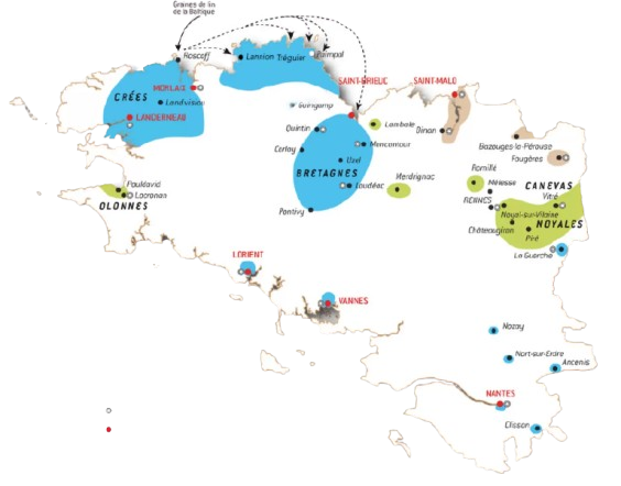 Le commerce des toiles de lin place alors la Bretagne au cœur d’un vaste réseau d’échanges internationaux. Les graines, importées notamment de Lituanie par le port de Roscoff, sont semées dans le Trégor, puis les toiles sont exportées vers l’Angleterre, l’Espagne et les colonies d’Amérique.